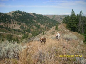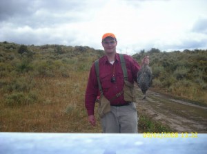 Upon arrival, the dogs and I hunted through the first draw without success. So we headed up the sagebrush bench to the north. I say “sagebrush bench,” but upon closer inspection, the benches also hold plenty of bitter brush and service berry bushes. Usually the service berries at this time of year are shriveled up like raisins, but this year they are juicy like grapes. As we worked our way up the bench, a big blue flushed unexpectedly right at my feet and scared the dickens out of me. Fortunately, I recovered in time to make good on a crossing, left to right shot. Sunny girl, my French Brittany, made a quick retrieve of my first bird of the year. When I later cleaned the bird at home, I found its crop chuck full of the purple service berries.