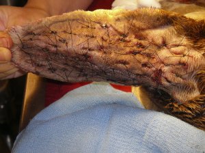 These are photos from a bird dog that developed an aural hematoma after getting a grass awn or weed seed in her ear after a recent September grouse hunt. Aural hematomas develop when a dog repeatedly shakes its head or causes trauma to the blood vessels in the ear, and hemorrhage occurs within the ear causing painful swelling. I wanted to share these photos to stress the importance of having your bird dog checked out if you suspect a problem! This aural hematoma may have been prevented had the owner brought their dog in as soon as she started shaking her head!