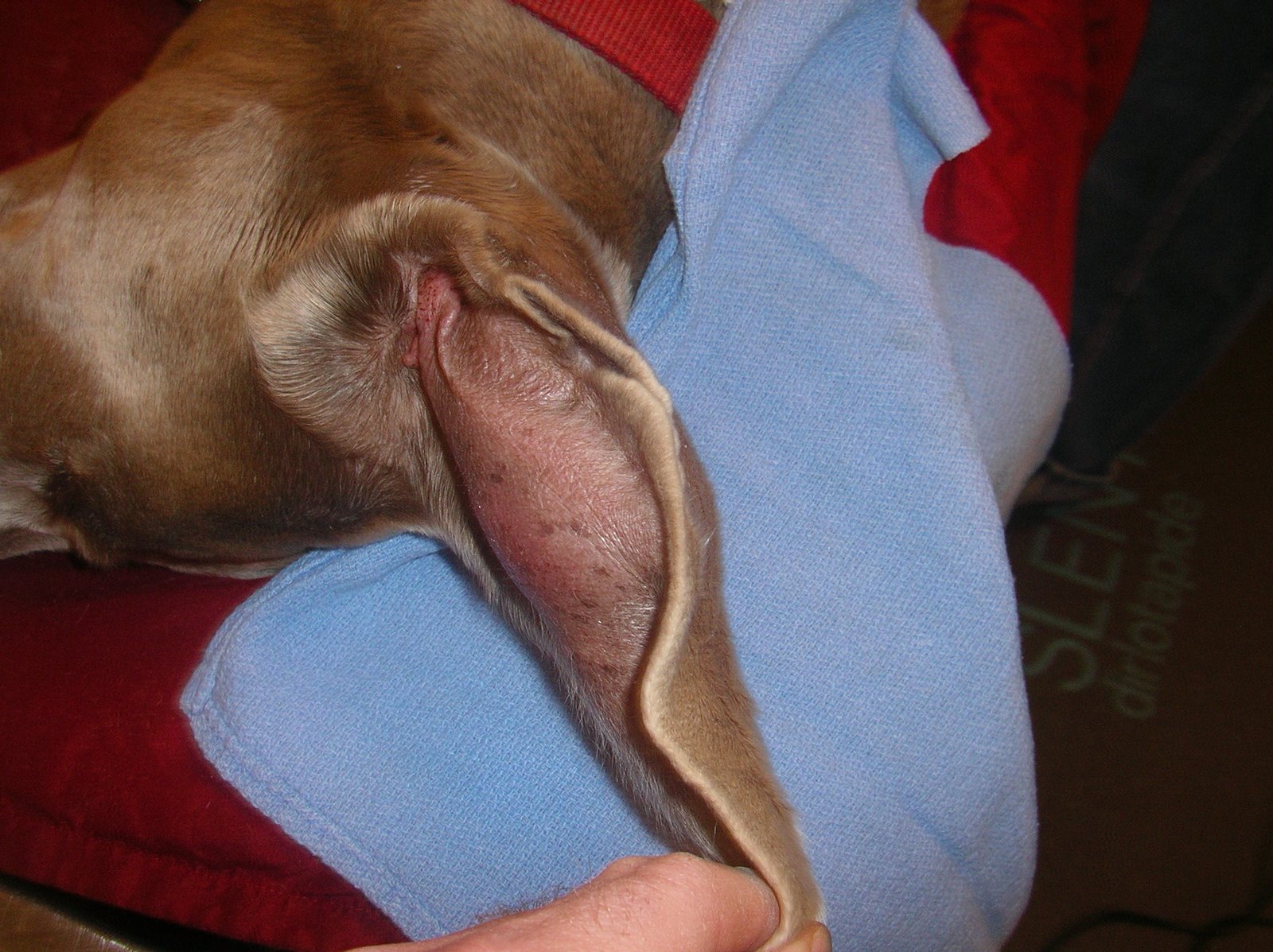 These are photos from a bird dog that developed an aural hematoma after getting a grass awn or weed seed in her ear after a recent September grouse hunt. Aural hematomas develop when a dog repeatedly shakes its head or causes trauma to the blood vessels in the ear, and hemorrhage occurs within the ear causing painful swelling. I wanted to share these photos to stress the importance of having your bird dog checked out if you suspect a problem! This aural hematoma may have been prevented had the owner brought their dog in as soon as she started shaking her head!