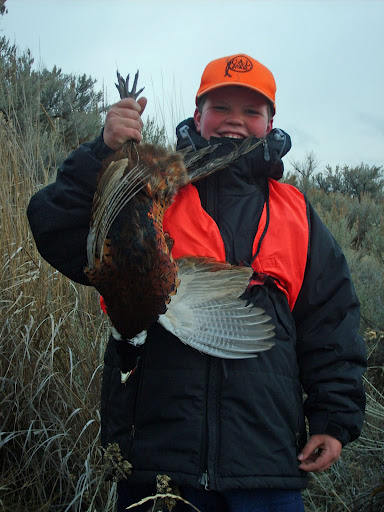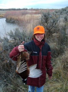 In light of the crowds of flourescent orange hunters, we decided to hunt through the end of the cover to see if we could find some more birds and then make our way over to the other side to locate the fallen rooster. About a half an hour later, we released the hounds on the opposite side of the canal to make the retrieve. Believe it or not, the “birddog” who found the fallen bird that windy morning was MacKenzie, my niece, not Sunny or Dusty, my dogs. I was more thrilled for MacKenzie’s and the other kids’ excitement and enjoyment of the success of the hunt than for myself. To preserve this moment, I took pictures of all three of the kids with their first rooster.