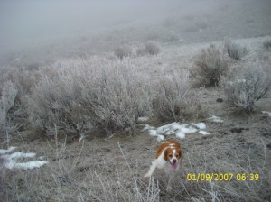 As we descended in elevation, the fog dissapated. Darby, Matt’s yellow Lab, soon busted a covey out of a thick creek bottom, but we had no shots. Further down the canyon, Darby pointed (keep in mind she is a flusher not a pointing Lab) into a thick willow patch. “Darby is on point. Get ready!” Matt exclaimed. When Matt kicked the thicket, a beautiful mail topnot blasted out to my right. Quickdraw Matt caught up with it first and, as it dropped from his shot, I thumped it again not a second later. Then Sunny girl, my French Brittany, ran over and retrieved the bird to hand. All four of us got a piece of the action!