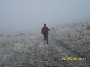 Matt and I had a fun hunt last Saturday, but we did not see nearly as many quail as Shawn. Upon arrival, we hiked down what I have dubbed, “the Trail to Quail,” into some public ground that has held phenomenal numbers of quail in the past. Unfortunately, the quail numbers were seriously low. That morning, the rolling landscape was blanketed with an eerie fog as we strolled down the trail.