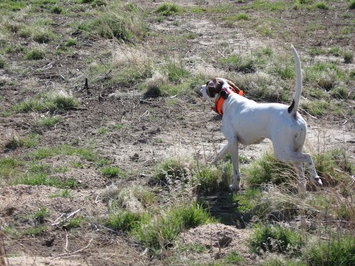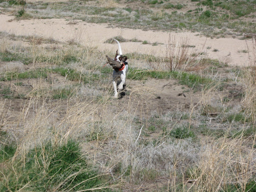We tried to find the pheasants later but there was no sign of them. I also lost the last chukar I put out. It spiraled up from Pride’s point almost like a woodcock and I foolishly let it figure out which way to go–of course that was downwind like a rocket! I was behind all the way but did pull feathers. We hunted after the bird on its line of flight. She found it crippled, on the edge of a thick juniper stand. I moved to the bird about the time Pride broke point and in the flurry the chukar dove into the tangle of limbs, roots and gopher holes. Never saw him again. Drat.(The lovely Joanne noted sagely that evening: “It’s hunting, not going to the market.” Hmm. May be something in that.)