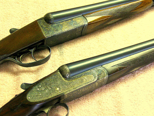 Some of you know, especially Scolopax, that I had made arrangements to import a gun from Scotland. It is a used AyA XXV 12 bore in the Churchill style with high, raised rib. I already had the boxlock version and wanted the sidelock. Graham Mackinlay of Glasgow, Scotland had one that was made in 1967, well before AyA started to cut corners on the engraving. The one I bought from him has exquisite engraving and about 85% case colors so the patina shows off the ribbon, rose and scroll to best advantage. Here are my “fraternal twins” now: the boxlock and the sidelock.