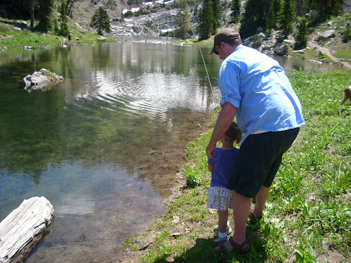 My daughter Eden reeling in her first trout from Bloomington Lake, a beautiful alpine lake in Idaho.