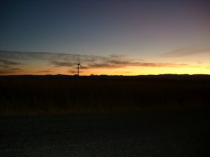 As we drove east to our destination, we were rewarded with a stunning view of the sunrise with the mini-Tetons in the background. The view was somewhat tainted by the wind power generators that plagued the horizon. (Double click on the picture to see the Tetons).