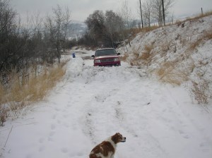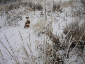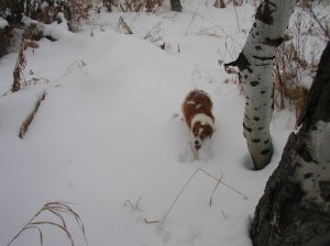 Yesterday, as Sunny and I approached the Royal MacNab–my favorite hunting covert in the world–we found a big snow bank, left by the county snowplow, which blocked our progress. This was the end of the road for Red Ed, my Ford Explorer, but not for Sunny and I. We would hoof it through the deep snow to the quakie-filled draws that held (hopefully) the object of our pursuit: ruffed grouse.