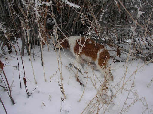At the top of the draw, Sunny girl became very birdy near an elderberry bush, the fruit of which had been shriveled by the sun and blown about by the wind on the snow. This happens to be right where we always run into this character and there were bird tracks all over. My heart started to pound heavily.