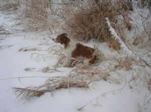 Sunny soon located the source of the scent and struck a stellar point. The picture below does not do her justice. I’ll never forget watching her nostrils flare as she sucked in the mesmerizing scent. As they often do, however, the wily bird snuck out from under her point.