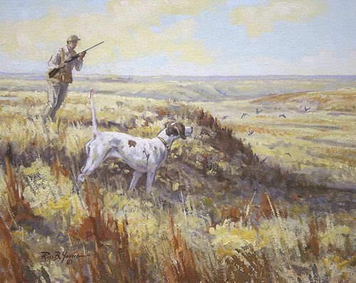 This ranch had 3 center pivots of corn out in the middle of the rolling sand sage with prairie grasses on the fringes. At O’dark-30 we’d spread out on the end of the pivots and wait for the chickens to wake the sand sage with their raucous calls…just at sunrise, they sped into the corn at waist height. We’d all get some shots off, but rarely saw feathers drifting. The excitement was over in a few minutes and then we’d spend the majority of the day trying to walk up chickens…with out much success, but it was dang fun.