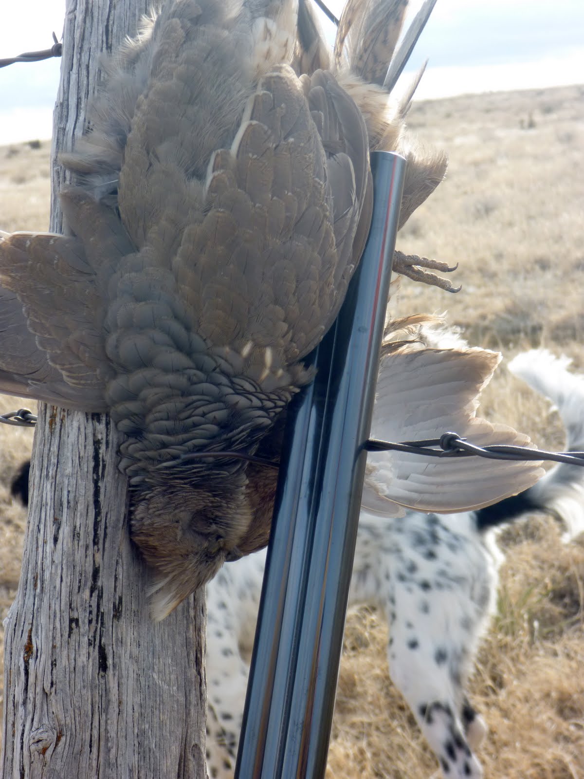 One afternoon we were headed back to the ranch from a Kansas gut-bomb-burger-greasy-fries lunch. We saw a large flock of birds land in a tree near one of the ranch houses. We all looked at each other and the same thought crossed our minds…what the heck are those birds? Wayments being Wayments (and a curious lot we are), we decided to chase the birds out of the trees and across a pasture…and we herded them into the adjacent sand sage. We then did what any normal upland enthusiasts would do…yes, we released the pointing dogs!