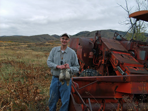 In circling back towards the truck, Matt and I dropped over the edge of the draw and made our way across the narrow creek and then up the other side to another rolling CRP field. Over the years, this area has always held good numbers of sharpies. To the east of this CRP field and uphill is a patch of quaking aspens that separated us from where Matt’s truck was parked. Matt and I spread out about twenty- five feet apart and let the dogs work through the area as we pushed up towards the quakies. Not far from the treeline, a grouse flushed about ten feet behind Matt . Like a man on a mission, I instinctively mounted my 12 gauge, swung out well ahead of the sharpie, tugged the trigger, and the bird folded.