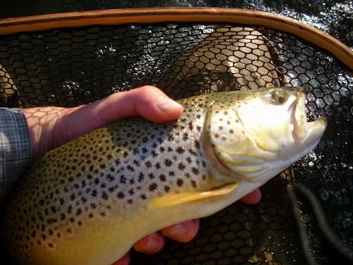 But the effort was well worth it because on my first cast into the pocket below the big rock, I instantly saw a noticeable disturbance behind my fly. I reared back with the rod in hopes that a fish took. When the hook sank home, the huge brownie pole vaulted into the air shaking his head in the process. This nice fish gave me the funnest fight I’ve had a long time as it leapt out of water five or six times.