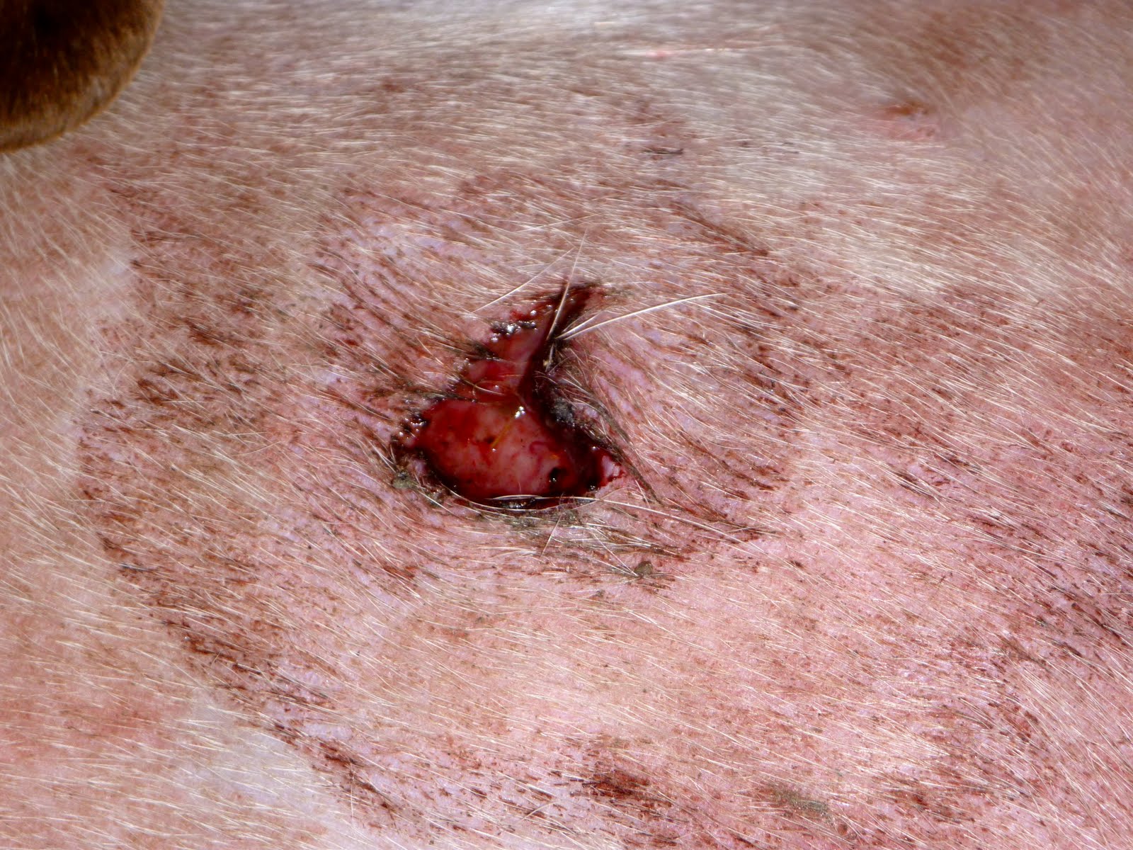 The edges of the wound were trimmed away to get fresh/clean margins and to allow blood and serum to cleanse the wound. The wound was cleaned with baby wipes from Costco and flushed with dilute Betadine Iodine solution in water