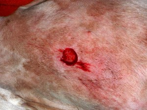 This past weekend I was out on the prairie in pursuit of birds with my bird dogs. We had 3 dogs get similar wounds from colliding with barbed-wire…the photos below are a representation of all 3 wounds…these are common field injuries that you’re likely to encounter while chasing your bird dogs. I’ve had several people contact me in regards to these types of wounds. Below is how I addressed these wounds (none of the 3 dogs were sedated prior to wound management).