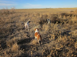 While hunting some rolling sand sage hills with Shawn and Casey on the second day of the hunt, I headed back toward the vehicle to water my dogs because of the heat. Afterwards, I hunted a new area across the two-track road and noticed a little divot in the landscape choked with a tumble weed called “thistle” by the locals. Casey mentioned earlier how much the birds loved this weed both for protection and for food. Once in the weeds, I immediately began to notice quail sign: droppings, feathers and tracks, which caused the heart to race with excitement.