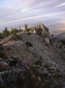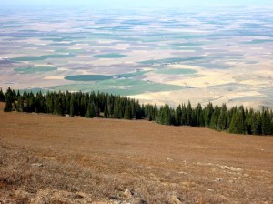 With Shawn and his dogs about seventy-five yards below me, we all side-hilled toward the mountain peak. In the Snake River Valley below us, we could see the patchwork of farms and also the circular areas indicating irrigation pivots for those in the know. The thought crossed my mind that they looked a little like UFO landing sites.