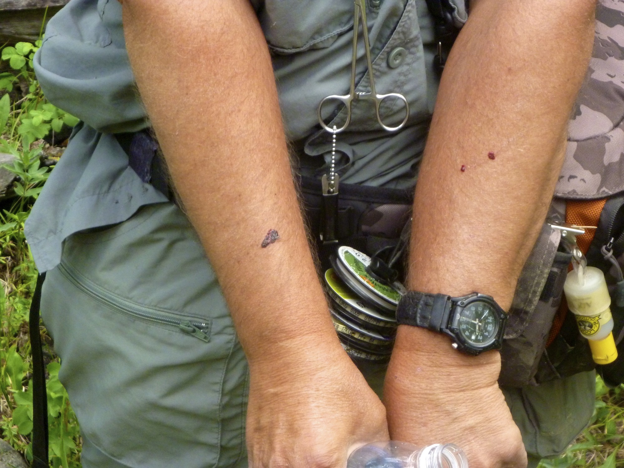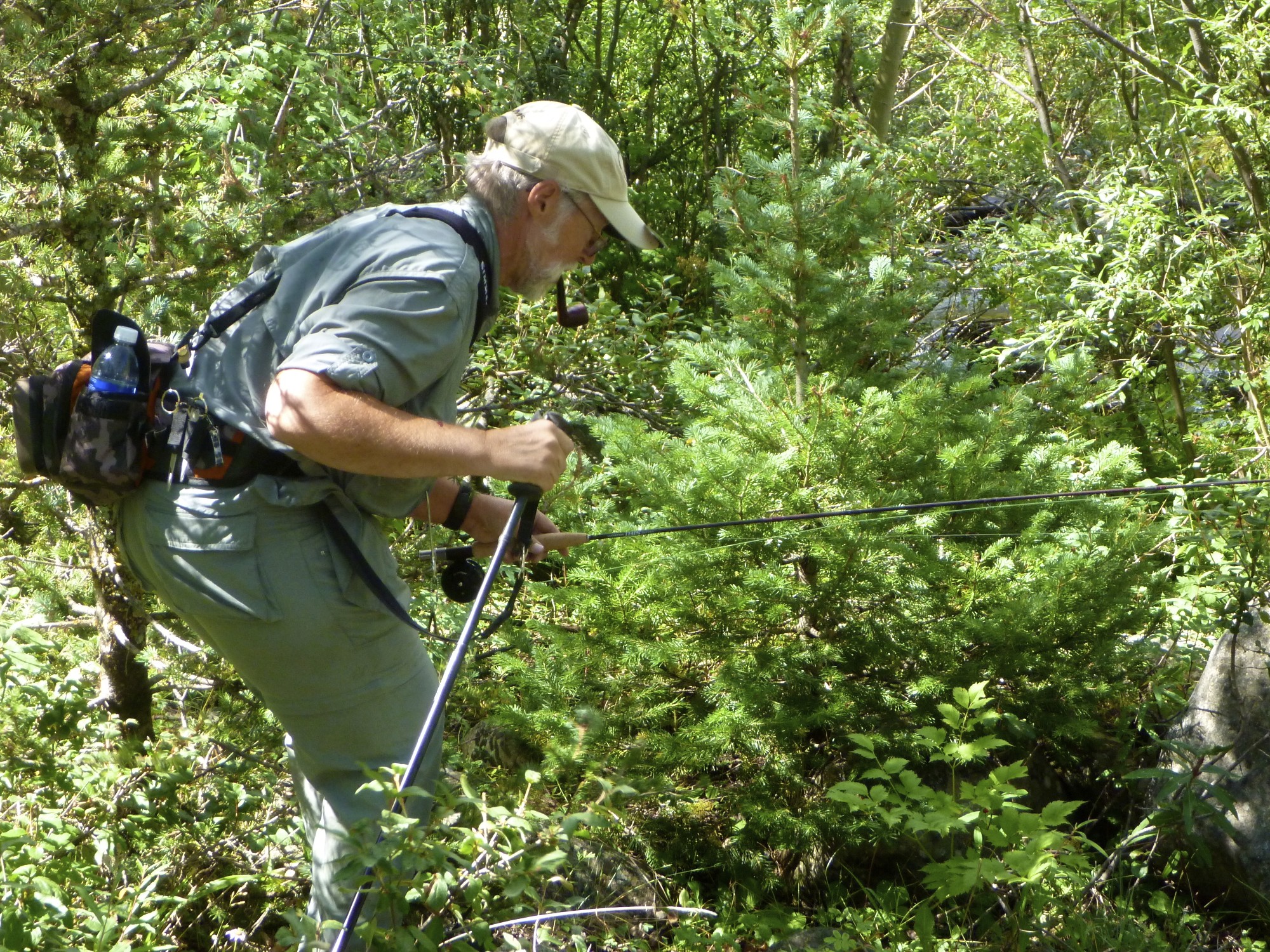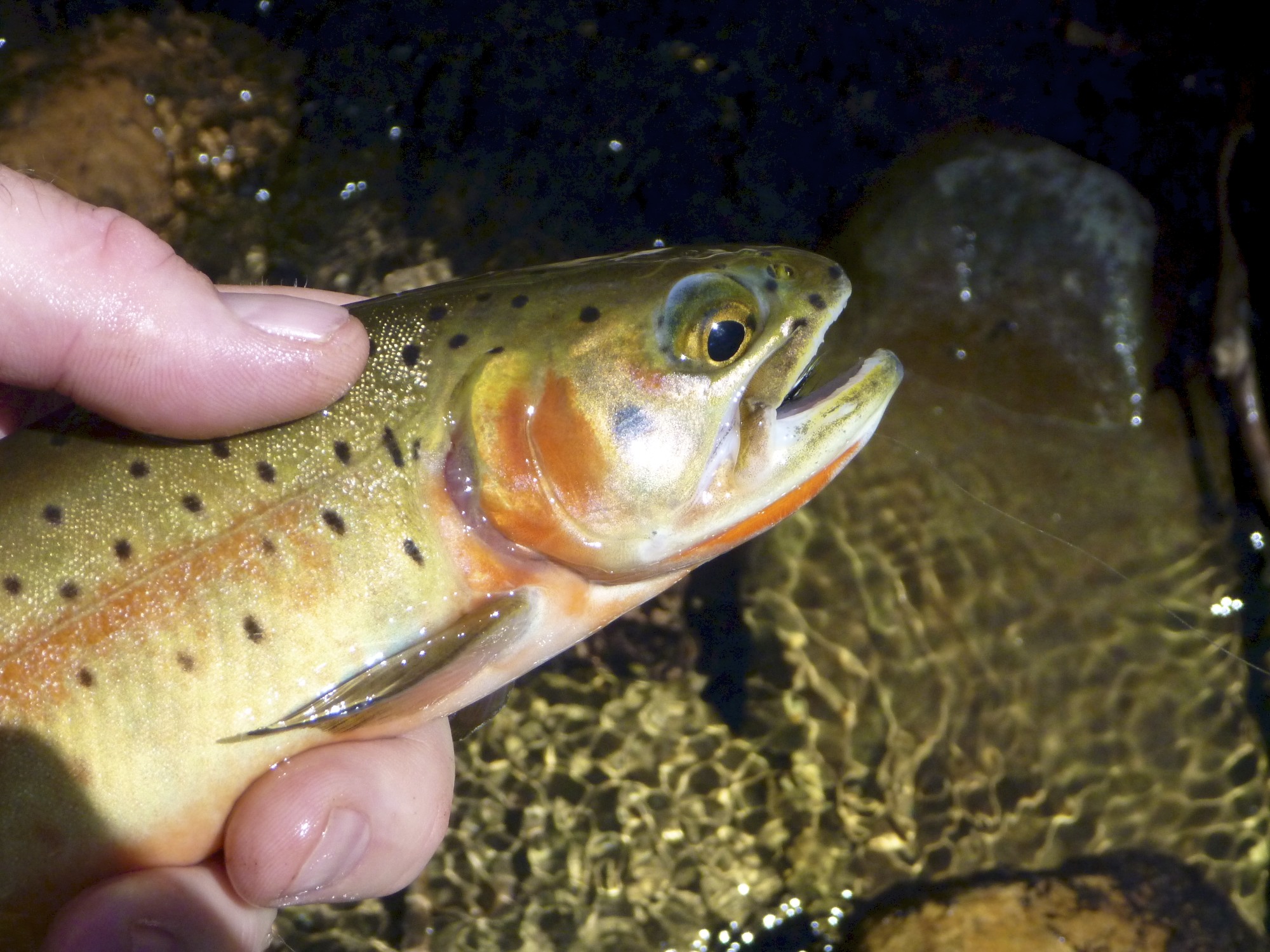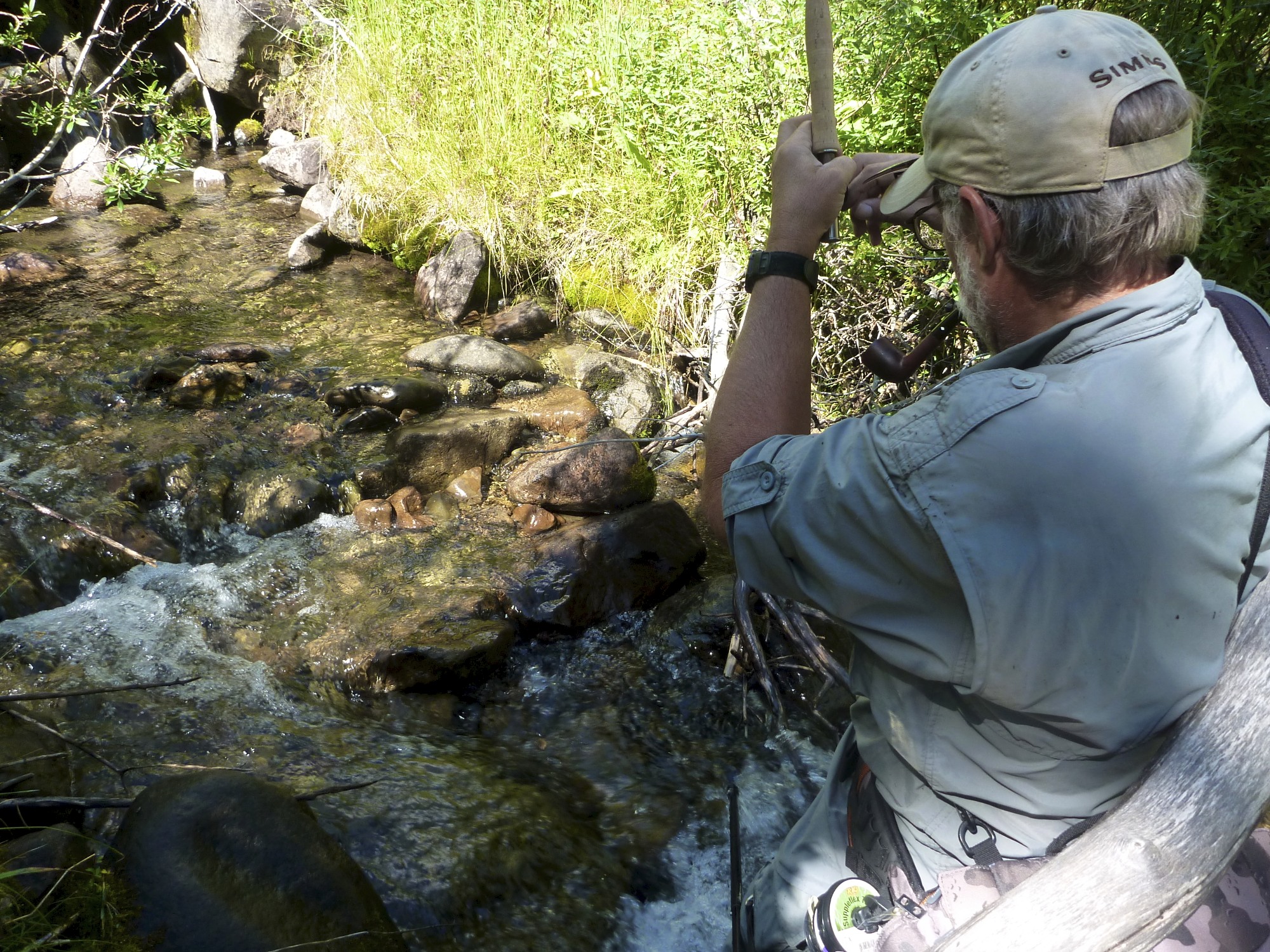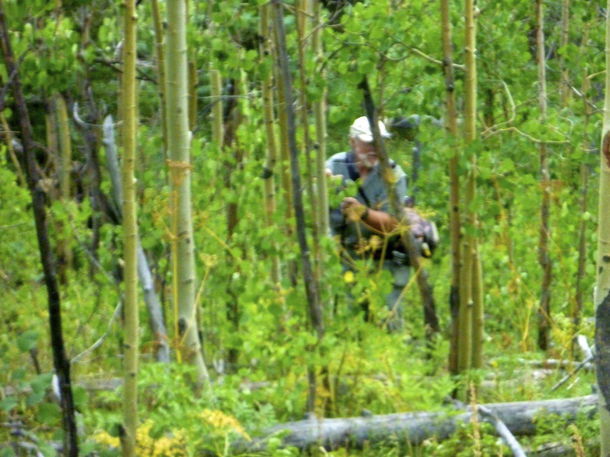 Greenbacks have been on retired veterinarian Tom’s mind for the past 5 years. Greenbacks on brush-choked-dead-fall-log-jammed backcountry streams like described in John Gierach‘s books. Bushwhacking his way to find those secretive Colorado gems and taking them stealthily on delicately placed dries tied by his own hands. Easy? Not if you have multiple sclerosis (MS). Tom was diagnosed in 2005, and his fishing has been limited to fishing where the footing is stable or from boats. Tom’s bucket list has included adding the greenback cutthroat to his species of a lifetime list. Tom contacted me last summer about it, and I explained to him how extremely dense and difficult it is for me to move on Can’t Tell Ya Creek. Tom took that as an I double-dog dare ya and began doing cross fit workouts 3 times a week which paid off! We spent 6 hours on the creek and Tom caught several very nice greenbacks and brookies. It was not easy for Tom, as he had to crawl over boulders and logs that I could step over. Tom climbed out of the creek bottom with blood on his arms and legs…but grinned with satisfaction. He christened my favorite creek Sangre de Thomas…