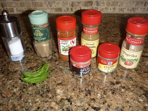 In bowl, mix the paprika, coriander, cumin, cayenne pepper, thyme, and bay leaves. Reserve the seasoning blend.