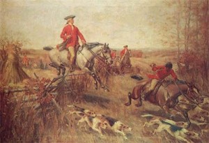 This painting depicts Washington and hounds in pursuit of the wily Reynard.