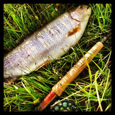 Almost at the end of the swing, I felt the strong, unmistakable jolt of a munching trout and I instinctively jerked back to drive the point home. At the hook’s bite, the acrobatic, beefy rainbow flipped out of the water and then peeled more line off my reel than any other fish has in a long time. At such moments a fisherman’s eyes bug out of their head and they wonder just how big the fish is at the end of their line. I giggled nervously.