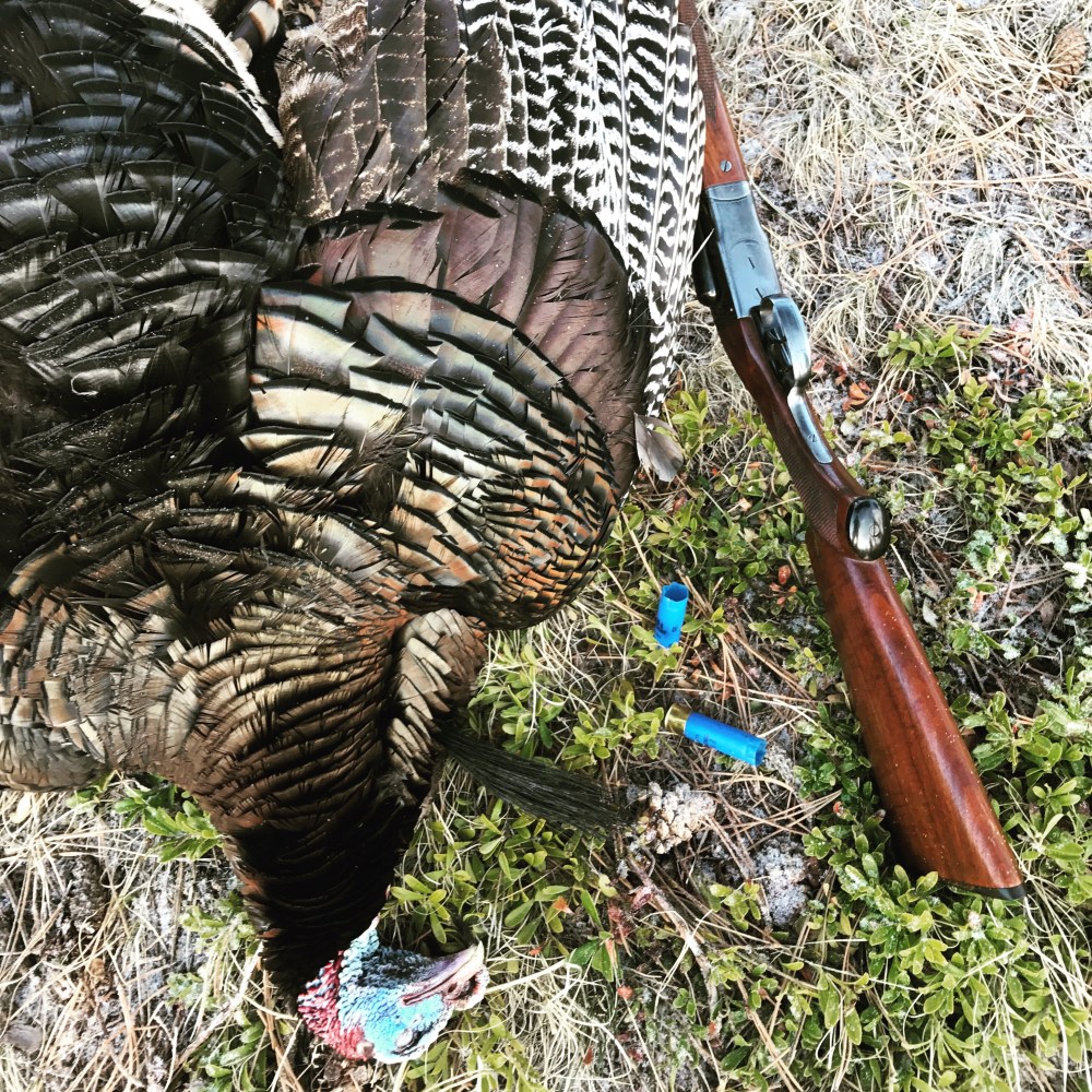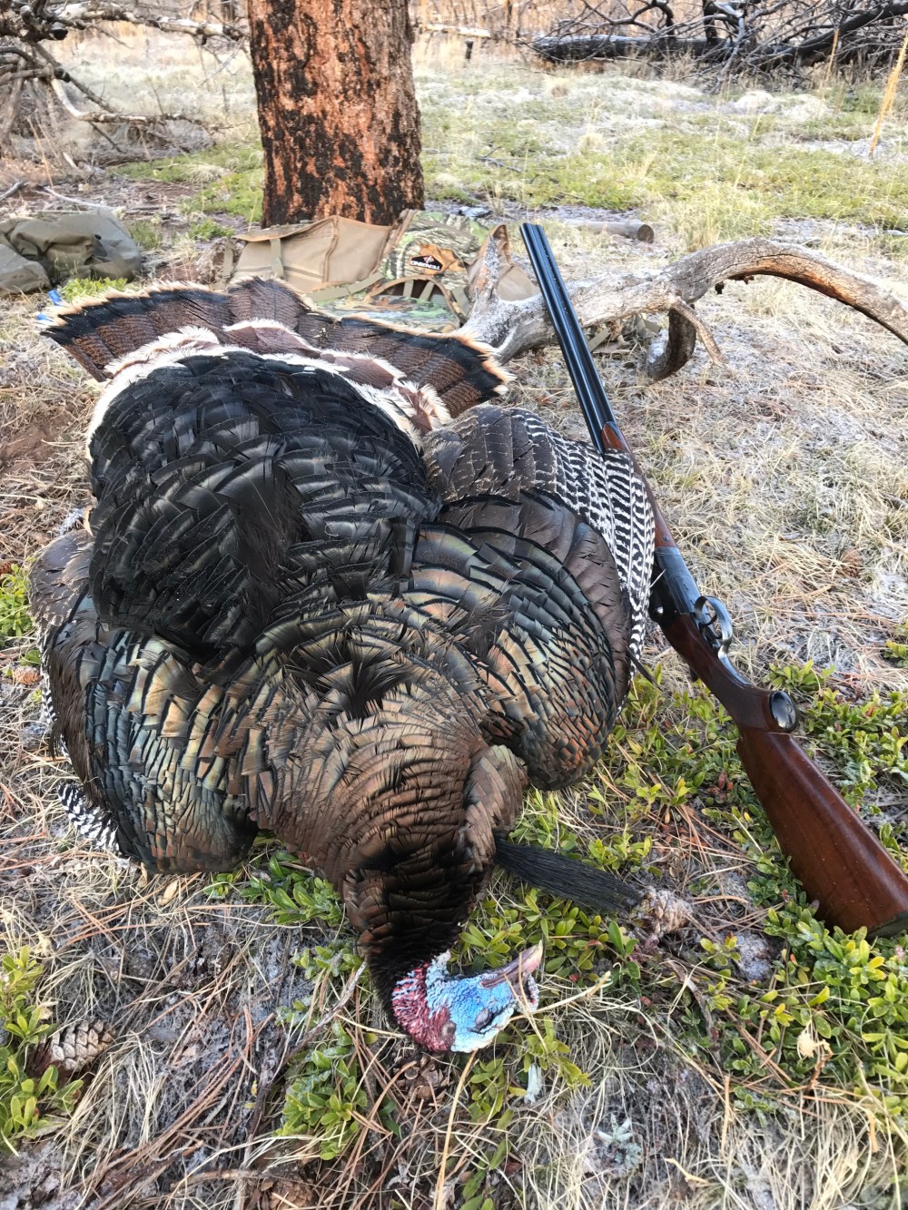 Saturday the 22nd of April at 0’dark-30 I was in the turkey woods listening to 7 or 8 different toms reveling in the nearby Ponderosas. I scrambled up the ridge to the snowline where there’s a flat area I know the birds love to strut. I’ve scared many a strutting tom off this area in the afternoons in previous seasons. I planned to sit there all day. I heard another tom up above the snowline as the sun started to peek up in the East. By 6:30 am I was surrounded by 12 to 15 turkeys, with a tom to my right strutting for his ladies and one directly behind me spitting and drumming. Another tom was heading to my Avian X decoys to thrash my jake…however he caught my movement and turned to escape! I rapidly raised my 1937 NID Ithaca 16 bore like a fleeting quail shot and fired the right barrel and he took off running so I fired the left full-choked barrel as he disappeared. I sat against the ponderosa awe-struct with a sickening depression weighing upon me. I had just blown the only chance I’d get today. I texted my brother Andy and our good friend Troy that I had just missed a nice tom with both barrels…then I texted Tyler Sessions and my wife the same depressing news. Clouds were starting to spit snow down on my turkey woods…I sat there and replayed over and over what had happened. I thought to myself that I had seen both barrels hit the bird in the head. I decided to walk down the hill a little to see if by chance my eyes hadn’t deceived me…AND there he was piled up on the forest floor. I was so ecstatic beyond believe!! I’m sure the other hunters in the area heard me holler!
