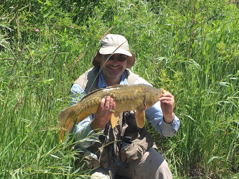 While still off color, the river had dropped some and we found numerous carp eating in the grassy flats along the river. We found these fish to be very cooperative. One even came out of the water to eat my leech pattern.
