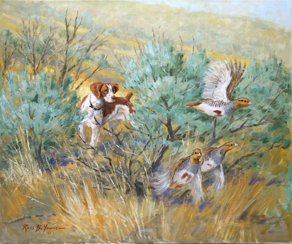 The book contains thirty-five self-contained chapters on various things relating to bird dogs and upland bird hunting in Idaho.  The book has numerous black and white photos throughout to support the stories and make the book more visually appealing.  I am also pleased to announce that Ross B. Young gave me permission to use his painting “Columbian Sharptails in the Foothills-Sharptail Hunting in Idaho” as the cover of the book.  Another painting of Ross’s, “Sagebrush Huns,” which was inspired by a hunt with my late Brittany, Misty, appears in the Introduction to the book.  What an honor it is to work with Ross, a fellow Idahoan, on this project!